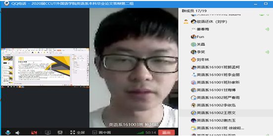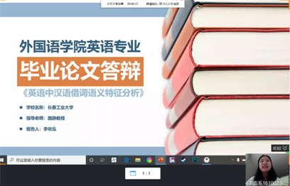 在英语系主任刘宇的精心安排下,网络视频答辩圆满结束。至此,2020届英语系学生,在论文指导教师的启发、指导和带领下,在自身不断努力钻研下,圆满完成毕业论文工作。相信他们在勤奋、求实、创新的工大精神的引领下,在今后的学习和工作中一定能够勇创佳绩,取得更辉煌的成绩!今日他们以工大为自豪,明日工大为他们而骄傲!