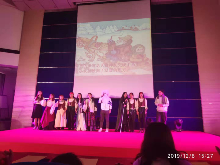 大二同学们则为大家奉上话剧《严寒老人》(《морозко 》)。同学们服装出彩,表情生动,台词功力一流,生动诠释了这部俄罗斯童话中的经典之作,收获全场热烈掌声和高度评价。