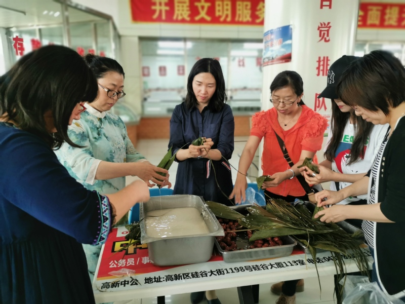 6月5日下午,私房俱乐部 组织全体教职工开展了端午“粽香传真情”活动。林园校区食堂为此次活动精心准备了优质的糯米、大大的红枣、棕绳方便袋等等,师傅们手把手交,老师们认认真真学,现场充满了祥和的节日气氛。