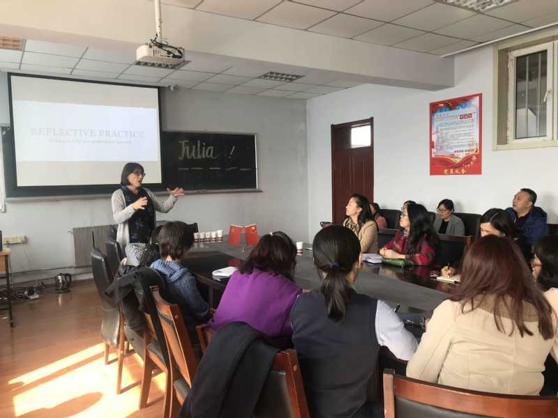 Julia MacRae介绍了反思性教学兴起及发展背景,并就如何进行反思性写作教学进行了模拟课堂形式的工作坊,通过反思性写作对于教学中存在问题进行剖析,从反思性写作中受到启发,从而对实践经验理性化再思考。老师们认真聆听讲座,同时也被Julia老师幽默生动的案例及认真严谨的治学作风所感染。