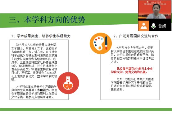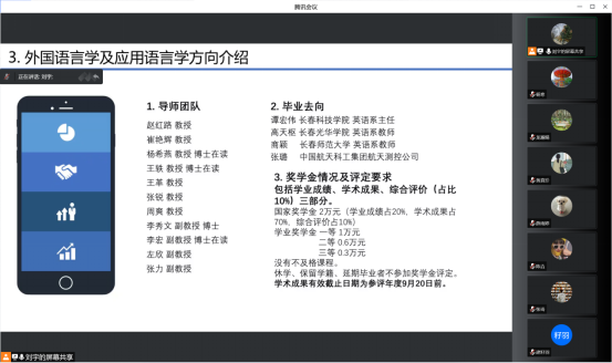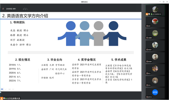 、英语专业的发展历程和取得的成果。全面地介绍了这两个方向的导师团队、近年的招生情况、毕业去向、奖学金评定规则,并讲解了个人培养计划,让同学们明晰培养目标和课程安排。在师生互动环节,详细解答了同学们的疑问,拉近了师生之间的距离。