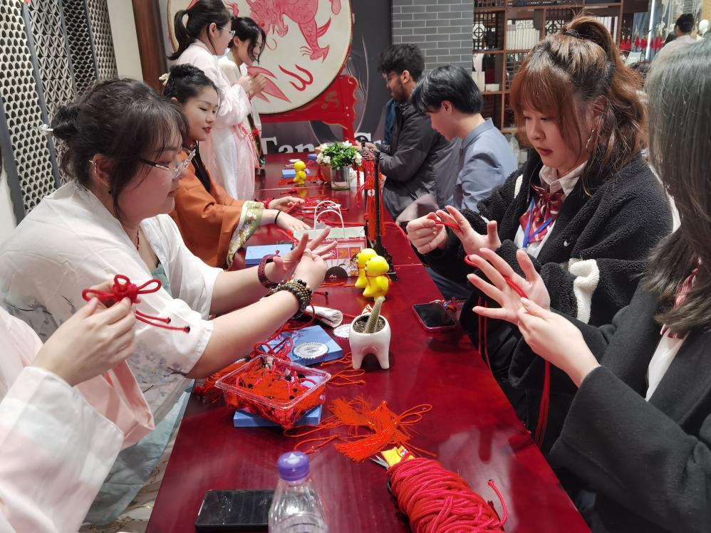 当日下午,在“中国村”场馆里,同学们认真地学习编制“中国结”,试穿中国传统服饰,让各国大学生近距离地体验了中国传统文化。