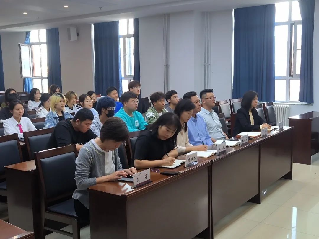 院长王轶,党委副书记于伟,副院长李秀文,副院长曾妍,英语系主任刘宇,翻译专业任课教师。会议由2023级辅导员刘明慧主持,2023级翻译专业全员参会。