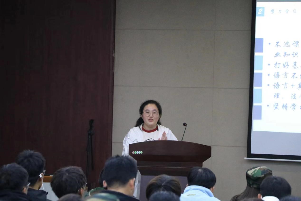 在主楼435教室,邀请十佳大学生葛堃和自立自强大学生韦佳进行专题报告会,为新生分享经验。
