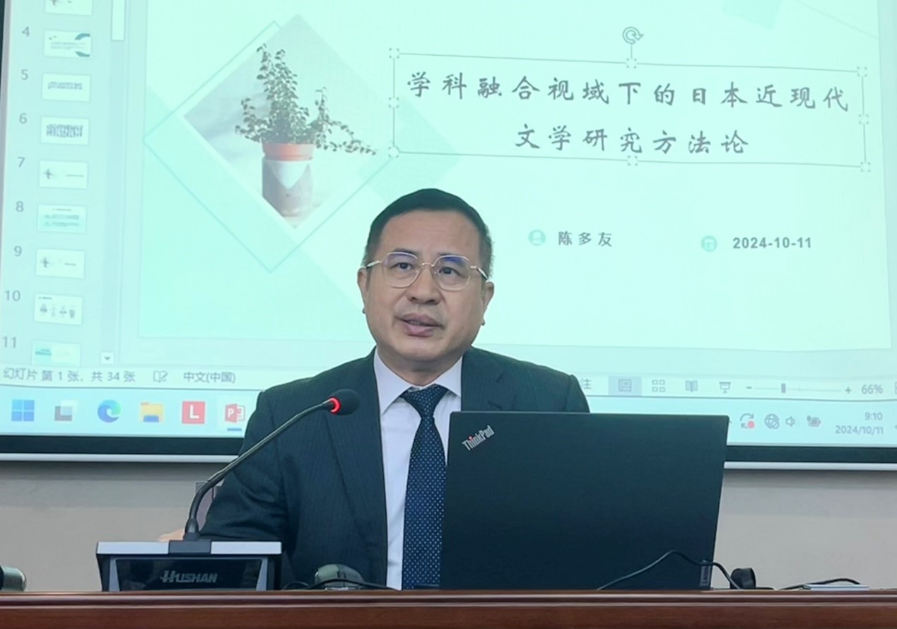名师大讲堂系列讲座在北湖东区教学主楼435报告厅顺利举行。本次讲座在校科研处的大力支持下,特邀了广东外语外贸大学东方学研究院院长、教育部高等学校外国语言文学类教学指导委员会日语分委员会委员、中国日语教学研究会会长陈多友教授担任主讲嘉宾,主题为“学科融合视域下的日本文学研究方法论”。学院党委书记张子宇、院长王轶、副院长李秀文、部分日语专业教师和私房俱乐部