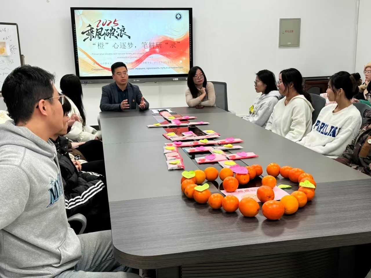 随后,刘凤利代表学院党委,为考研学生代表送上橙子和文具袋,寓意“橙”心逐梦、笔耕研“录”。希望同学们在品尝橙子甘甜的同时,能坚定心中的信念,在考场上执笔乘风,收获成功的果实。