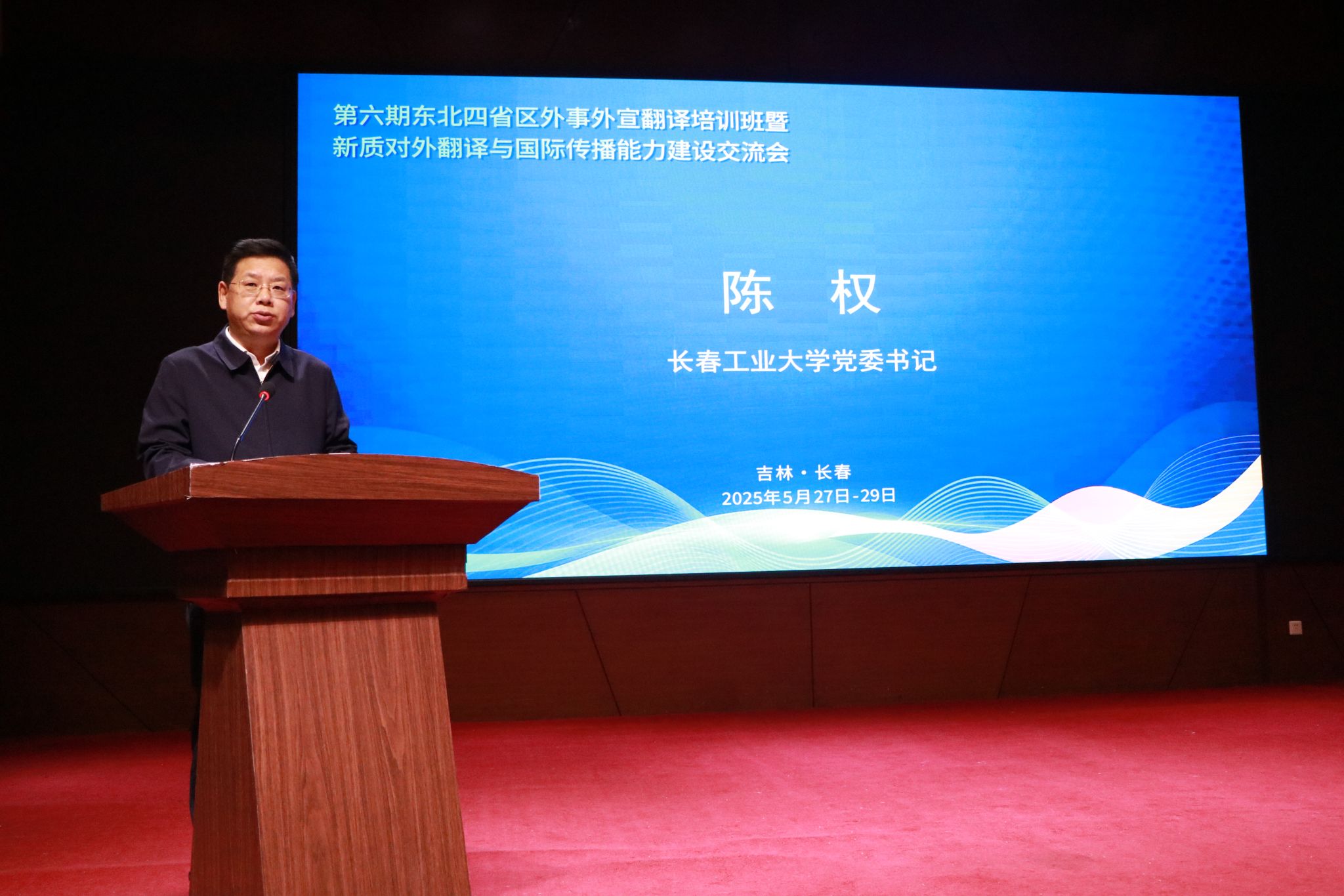 学校党委书记陈权代表学校致辞,对联合主办单位的信任与支持表示感谢,并介绍了学校的发展概况。同时指出,本次培训班与交流会,正是立足时代之需、发展之要,旨在以“新质翻译力”赋能国际传播实践,以专业交流碰撞思想火花,为外事工作者与高校教师搭建共学、共研、共进的平台。