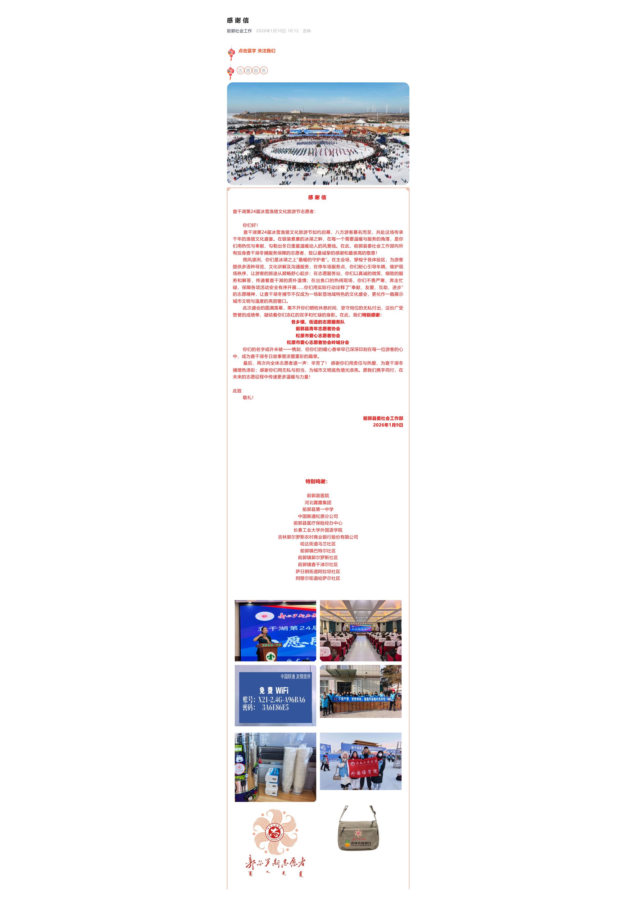 学生投身查干湖第24届冰雪渔猎文化旅游节开幕式,以专业翻译能力为盛会助力添彩,相关事迹获松原市官方媒体报道,学院收到相关部门的感谢信。