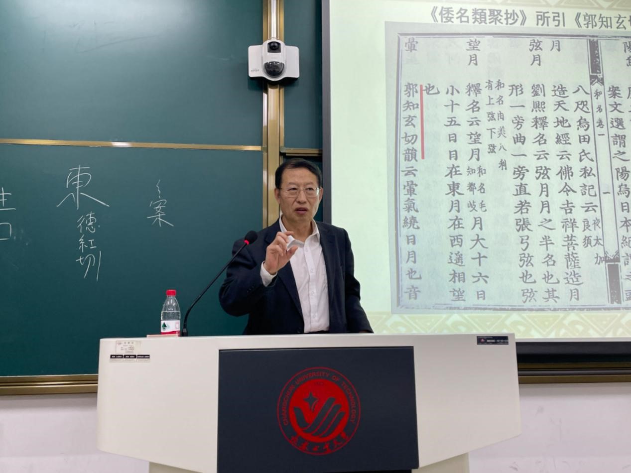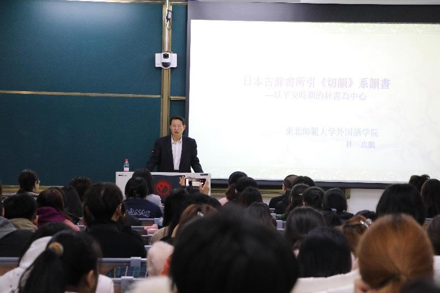报告会上,林忠鹏教授以失传文献《切韵》在日本平安时代的典籍中的引文考证为例,介绍中日古典文献研究的一个侧面。首先,林教授介绍了中国的韵书《切韵》及其作者陆法言,然后介绍了日本平安时代的三部主要辞书:《新撰字镜》、《倭名类聚抄》和《图书寮本类聚名义抄》,并分别举例阐述了三部日本辞书引用中国韵书《切韵》的具体情况。他指出:日本自古以来向往中国文化,日本古代文化的发展过程充满了中华文化的元素。隋唐时期派来的遣隋使、遣唐使来到中国学习中国文化的同时,把大量的经典文献带回日本,对日本的社会文化发展发挥了重要作用。然而,这些经典文献多数在我国很早就已经失传而在日本以各种形态得以保存。因此,研究日本古籍资料,辑佚我国失传的文化瑰宝具有极其重要的意义和价值。林教授语言风趣幽默,用生动的讲解让高深的问题变得浅显易懂,其精辟的分析和独到的见解赢得了同学们的阵阵掌声,会场氛围热烈。