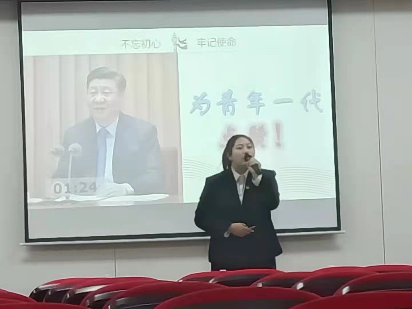 南湖校区学术报告厅举办的“请党放心,强国有我”的主题演讲比赛中,211005班的刘婧同学代表私房俱乐部