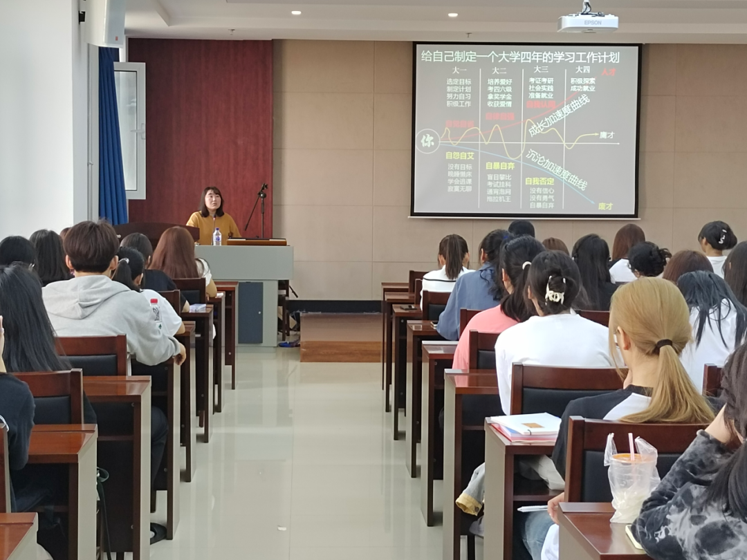 在班会上同学们思考了自己大学四年的学习工作计划,刘明慧老师也详细提出了对同学们大一到大四的建议和要求: